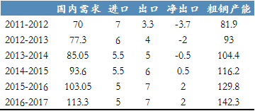 印度十二五計(jì)劃(2012年4月-2017年3月)末期,鋼材年需求將從本財(cái)年(截至2012年3月)的7000萬噸增加到1.133億噸,增幅超60%。如果GDP同比增幅保持在9%的話,印度國內(nèi)鋼材消費(fèi)量將在“十二五”期間同比增長10.3%。截至2017年3月份,印度國內(nèi)粗鋼年產(chǎn)能將增加到1.423億噸,當(dāng)前年產(chǎn)能為8190萬噸。2016-2017財(cái)年,印度成品材進(jìn)口量將小幅提升至500萬噸,出口量將實(shí)現(xiàn)翻番至700萬噸。同時,印度將于2014-2015財(cái)年實(shí)現(xiàn)鋼材凈出口,而受印度煉鋼產(chǎn)能的限制,過剩產(chǎn)能有限,因此成品材難實(shí)現(xiàn)大批量出口。如果擴(kuò)產(chǎn)項(xiàng)目能夠如期進(jìn)行,印度產(chǎn)量將能夠正好滿足國內(nèi)需求,但擴(kuò)產(chǎn)項(xiàng)目一旦推遲進(jìn)行,供需情況將趨緊。