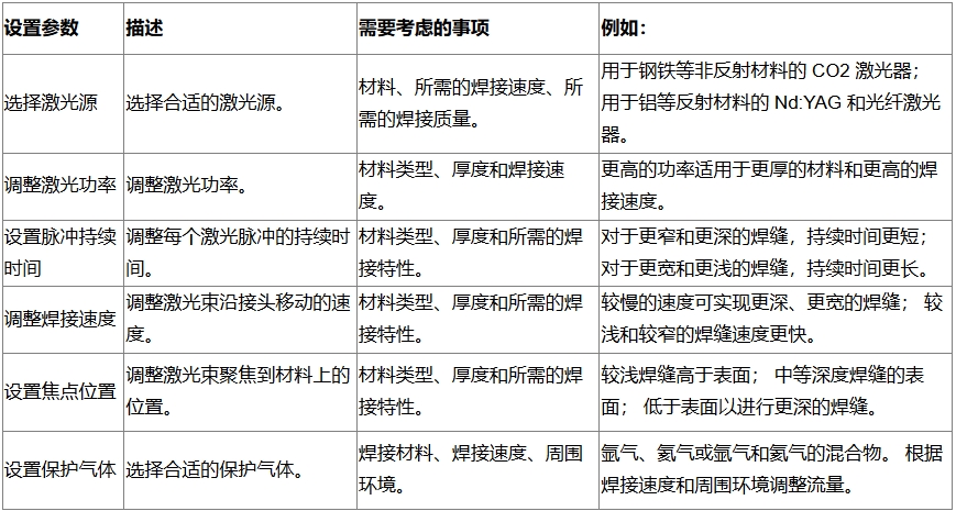 準(zhǔn)備好焊接材料后,下一個(gè)關(guān)鍵步驟是設(shè)置激光焊接機(jī)。 這涉及配置各種參數(shù),例如激光功率、脈沖持續(xù)時(shí)間、焊接速度和焦點(diǎn)位置。 這些參數(shù)中的每一個(gè)都會(huì)顯著影響焊接質(zhì)量,因此根據(jù)材料類型、厚度和所需的焊接特性仔細(xì)調(diào)整它們非常重要。